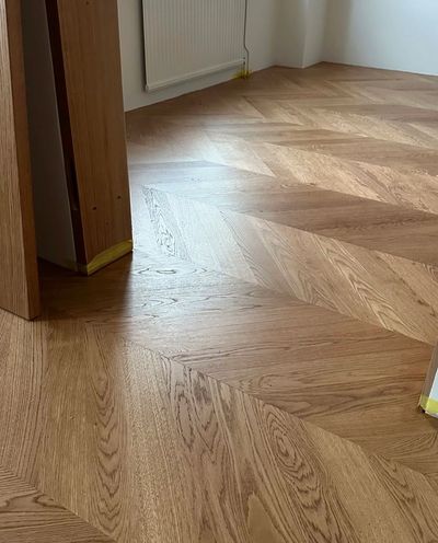 Chevronparkett är ett stilfullt golvmönster där brädorna möts i skarpa vinklar och bildar ett distinkt V-format mönster. Denna design skapar en elegant, geometrisk känsla som ger rummet en modern och dynamisk atmosfär.
